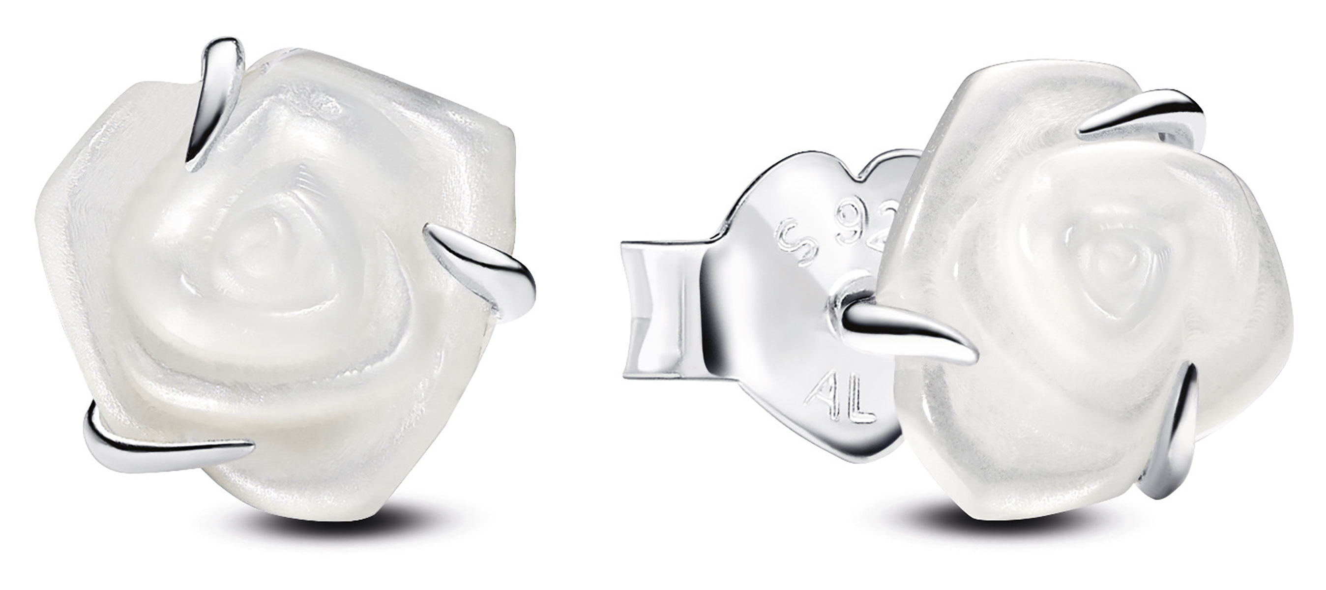 Pandora White Rose in Bloom 293209C01 kauniit valkoiset ruusukuvioiset helmiäskorvakorut on valmistettu sterling-hopeasta ja keinotekoisesta helmiäisestä biohartsista. Korvakoruissa on tappikiinnitys ja ne ovat kooltaan 8 x 7,3 mm.