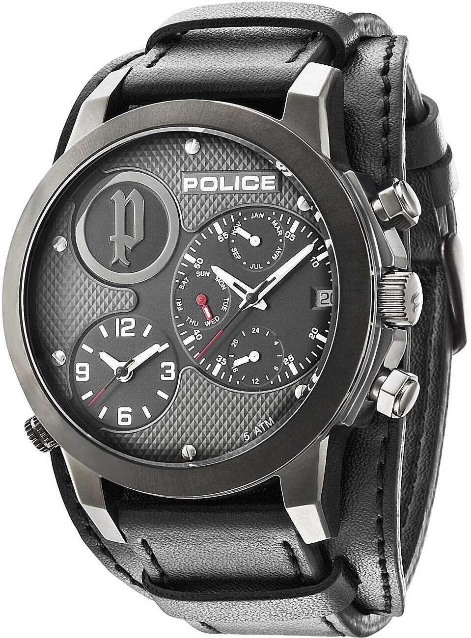 Miesten Police PL14188JSU/61 rannekello. Kellon hopean/harmaan rungon leveys on 51mm ja mustan nahkarannekkeen 22mm. Kellossa on kaksi viisarinäyttöä, joten se voidaan asettaa käymään kahden eri aikavyöhykkeen aikaa. Kellossa on myös päivyri. Kellolle myönnetään kahden vuoden takuu ja toimitetaan valmistajan alkuperäisessä rasiassa postikuluitta!