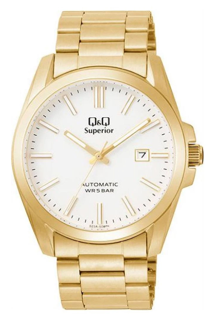 Q&Q 50th Anniversary Automatic S23A-508PK on upea 50-vuotisjuhlamalli, jossa täyteläinen kullanvärinen viimeistely kohtaa puhtaan valkoisen kellotaulun. Tämä Superior-sarjan automaattikello on suunniteltu niille, jotka haluavat kelloltaan näyttävyyttä, arvokkuutta ja perinteistä mekaanista luotettavuutta.