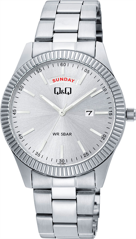 Q&Q A14A-003PY miesten rannekellossa on upea hopeanvärinen ulkonäkö, joka jatkuu kellon rungosta, kellotaulusta ja kehyksestä teräsrannekkeeseen asti. Kellon runko on valmistettu kestävästä metalliseoksesta ja se leveydeltään 40 mm ja paksuudeltaan 8,5 mm. Kellossa on luminoidut viisarit ja indeksit, jotka auttavat kellotaulun lukemisessa pimeässä. Kellon kokonaispaino on 99 grammaa. Kestävä mineraalilasi suojaa hopeanväristä kellotaulua, jossa on päivyri klo 3 kohdassa. Ruostumattomasta teräksestä valmistetun rannekkeen leveys kiinnityskohdasta on 20 mm ja pituus 150 - 210 mm. A14A-003PY-kellossa on paristokäyttöinen Miyota 2350 kvartsikoneisto ja se kuuluu vesitiiviysluokkaan 50m / 5atm eli se on rajoitetusti vesitiivis (uintia ei suositella).