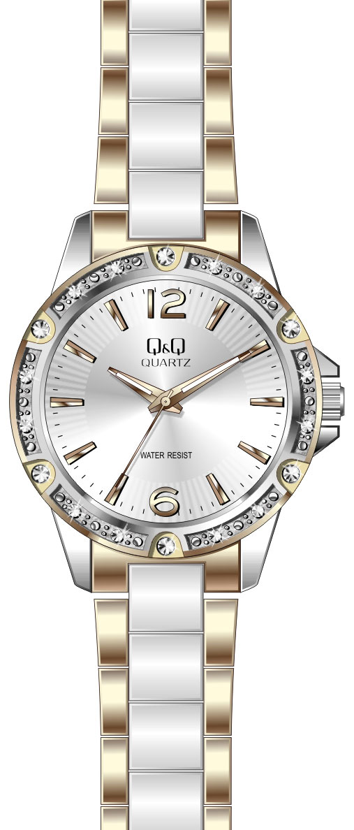 Q&Q F533J411N naisten rannekello on valmistettu kestävästä metalliseoksesta, jossa on kulta- ja hopeanvärinen värimaailma. Kellon runko on leveydeltään 38 mm ja paksuudeltaan 9 mm ja kehys on koristeltu kirkkailla zirkonioilla. Mineraalilasi suojaa hopeanväristä kellotaulua, jossa on luminoidut viisarit. Metallirannekkeen leveys kiinnityskohdasta on 18 mm ja pituus 165 - 200 mm. F533J411N-rannekellossa on paristokäyttöinen Miyota kvartsikoneisto ja se kuuluu vesitiiviysluokkaan 30 m / 3 atm, eli se on roiskevesitiivis.