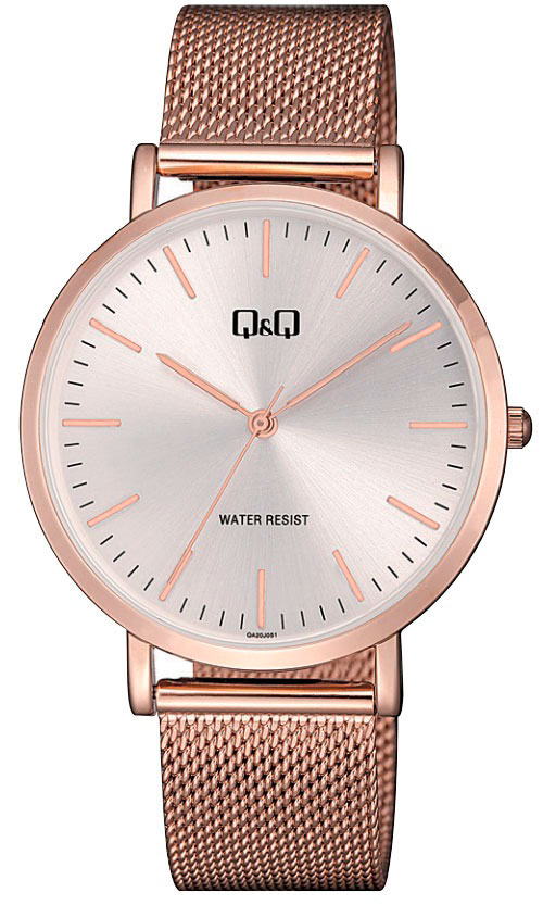 Q&Q QA20J051N naisten kvartsikello on valmistettu metalliseoksesta, ja sen rungon leveys on 40 mm ja paksuus 8 mm. Kellotaulua suojaa kestävä mineraalilasi, ja siinä on punakullanväriset viisarit ja indeksit. Punakullanvärisen metallirannekkeen leveys kiinnityskohdasta on 18 mm ja pituus 165 - 210 mm. QA20J051N-rannekello kuuluu vesitiiviysluokkaan 30 m / 3 atm, eli se on roiskevesitiivis.