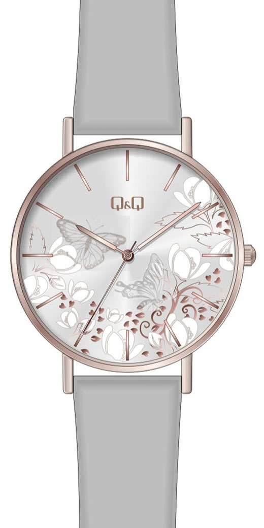 Q&Q QA20J111N naistenkellossa on hopea/harmaa ulkomuoto, jossa korostuu kellotaulun upea kukka- ja perhoskuviointi. Kellossa on Miyota Cal.2035 -kvartsikoneisto ja sen runko on valmistettu kestävistä metalleista. Rungon leveys on 40 mm ja paksuus 8 mm. Harmaan nahkarannekkeen leveys kiinnityskohdasta on 18 mm ja pituus 170 - 210 mm. Kellon paino on vain 37 grammaa. QA20J111N -rannekello kuuluu vesitiiviysluokkaan 30 m / 3 atm, eli se on roiskevesitiivis.