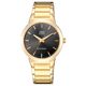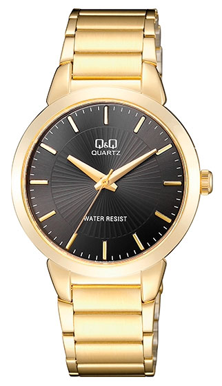 Q&Q QA42J002N on muodikas ja moderni miesten kvartsikello, jossa on iso, mineraalilasilla suojattu musta kellotaulu ja kullanvärinen metalliranneke. Kellon metallirunko on leveydeltään 39 mm ja paksuudeltaan 8 mm. Metallirannekkeen pituus on 160 - 200 mm. QA42J002N-rannekello kuuluu vesitiiviysluokkaan 30 m / 3 atm, eli se on roiskevesitiivis.