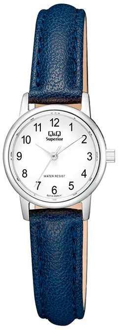 Q&Q S01A-004VY naistenkellossa on elegantin yksinkertainen muotoilu, jonka vuoksi kello sopii mihin tahansa tilanteeseen. Kellossa on Miyota Cal.2035 -kvartsikoneisto, jonka pariston kesto on n. 3 vuotta. Kellon runko on valmistettu ruostumattomasta teräksestä, jonka leveys on 24 mm ja paksuus 8 mm. Kestävä mineraalilasi suojaa valkoista kellotaulua, jossa on mustat numeroindeksit. Sinisen nahkarannekkeen leveys kiinnityskohdasta on 12 mm ja pituus 130 - 170 mm. S01A-004VY -rannekello kuuluu vesitiiviysluokkaan 30 m / 3 atm, eli se on roiskevesitiivis.