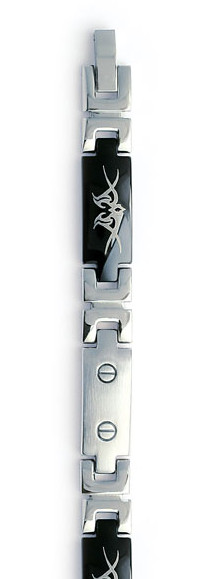 Tässä Bijoux CN rannekorussa on käytetty joka toisena palana mustaksi värjättyjä osia, joissa on tribal-kuvio. Tämä leikkisä rannekoru on pituudeltaan 21cm ja saat säädettyä sen juuri sinulle sopivan kokoiseksi ottamalla paloja pois välistä. Tuotteen leveys on 8mm. Katso myös muut Bijoux CN -tuotteemme.