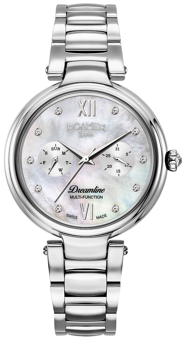 Roamer Dreamline Multifunction 600821 41 29 50 on kaunis naisten rannekello Swiss Made Ronda 706.1 -kvartsikoneistolla. Roamer 600821 41 29 50 -kellon ruostumattomasta teräksestä valmistetun hopeanvärisen rungon leveys on 36 mm. Rannekkeena tässä mallissa on hopeanvärinen teräsranneke. Helmiäiskellotaulussa on kaksi pienempää kellotaulua, joista näkee helposti viikonpäivän sekä päivämäärän. Kellotaulua suojaa safiirilasi. Kello kuuluu vesitiiviysluokkaan 50 m / 5 atm eli se on rajoitetusti vesitiivis (uintia ei suositella).