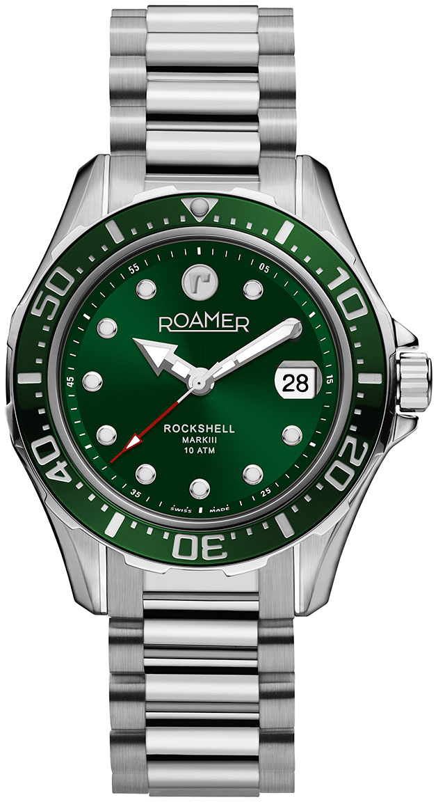 Roamer Rockshell Mark III 220660 41 75 20 on sporttinen miesten rannekello, joka on varustettu Swiss Made STP1-11 -automaattikoneistolla. Koneistossa on 48 tunnin käyntivara. Roamer 220660 41 75 20 -automaattikellon ruostumattomasta teräksestä valmistetun hopeanvärisen rungon leveys on 42 mm. Rannekkeena tässä mallissa on hopeanvärinen ruostumaton teräsranneke. Vihreää kellotaulua koristaa luminoidut indeksit ja osoittimet sekä päivyri. Kellotaulua suojaa safiirilasi, jossa on suurennuslasi päivyrin kohdalla. Tyylikkään ulkonäön viimeistelee keraaminen bezel. Kello kuuluu vesitiiviysluokkaan 100 m / 10 atm eli se on uintitiivis. Roamer-kellot toimitetaan valmistajan alkuperäisessä rasiassa.