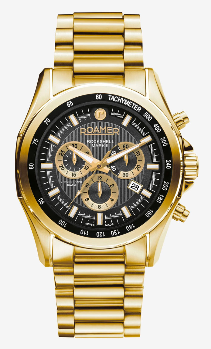 Roamer Rockshell Mark III Chrono 220837 48 55 20 on miesten kronografikello, joka on varustettu Swiss Made Ronda 5030.D -kvartsikoneistolla. Roamer 220837 48 55 20 -kellon ruostumattomasta teräksestä valmistetun kullanvärisen rungon leveys on 44 mm. Rannekkeena tässä mallissa on kullanvärinen teräsranneke. Mustaa kellotaulua koristaa indeksit ja osoittimet, päivyri sekä kolme pienempää kellotaulua. Kellotaulua suojaa safiirilasi. Kellotaulun ulkoreunaa kiertää lisäksi takometriasteikko. Kello kuuluu vesitiiviysluokkaan 100 m / 10 atm eli se on uintitiivis. Roamer-kellot toimitetaan valmistajan alkuperäisessä rasiassa.