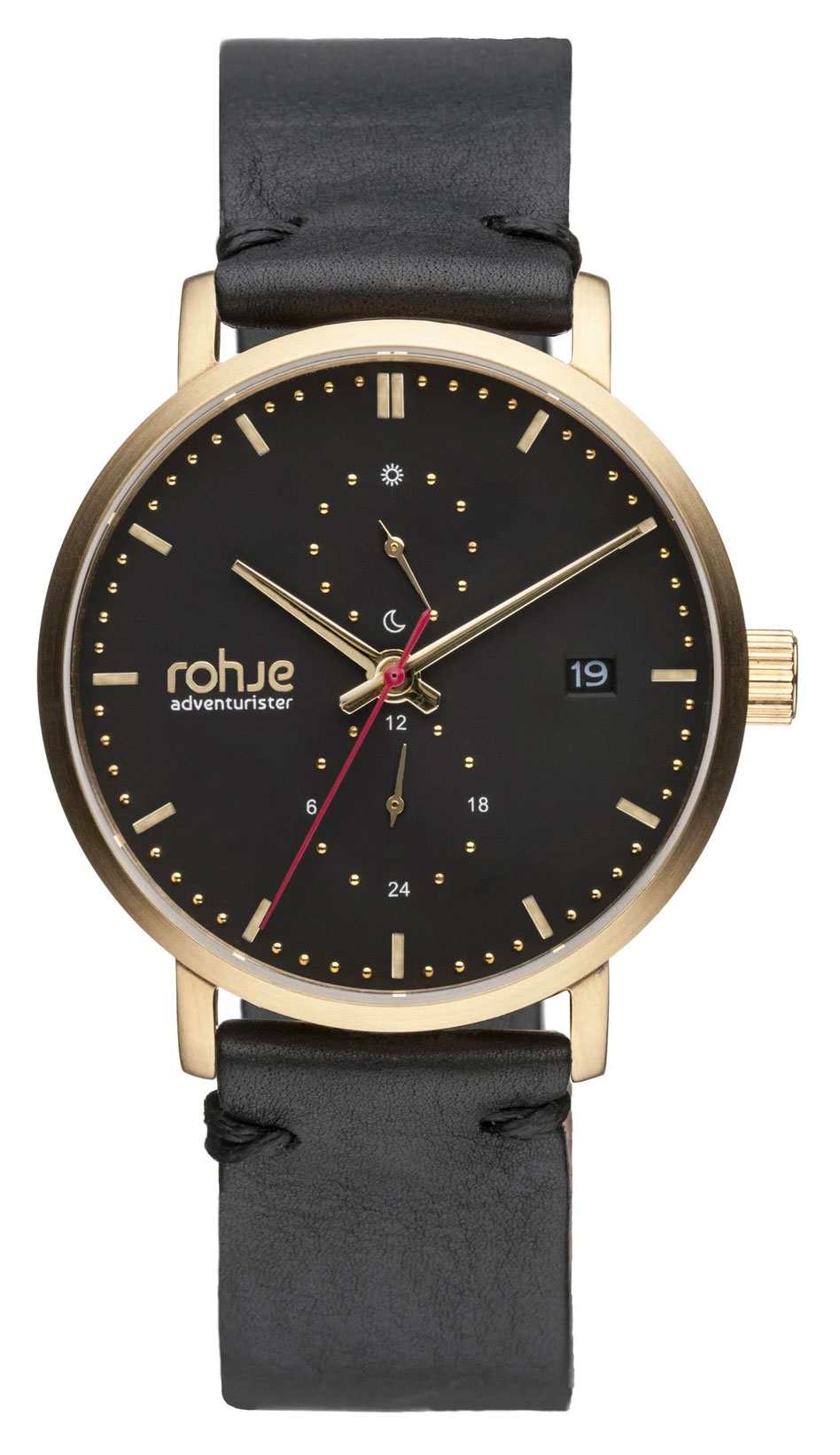 Rohje Adventurister Gold RL1MBB on tyylikäs rannekello, joka sopii niin miehille kuin naisillekin. Kellon 40 mm leveä ja 8,2 mm paksu runko on valmistettu kullanvärisestä ruostumattomasta teräksestä. Runkoon kiinnittyy aito poronnahkaranneke, jonka leveys kiinnityskohdasta on 20 mm. Safiirilasin alla suojassa on musta kellotaulu, jossa kaksoisaika, päivyri sekä päivä/yö-indikaattori. Rohje Adventurister Gold RL1MBB -kello kuuluu vesitiiviysluokkaan 50m / 5atm eli se on rajoitetusti vesitiivis (uintia ei suositella). Kotimaisille Rohje-kelloille myönnetään kahden vuoden takuu ja ne toimitetaan valmistajan alkuperäisessä pakkauksessa.