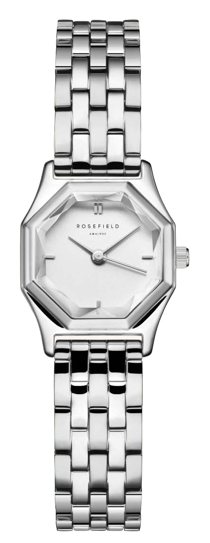 Rosefield Gemme GWSSS-G04 -naisten kellon ainutlaatuinen kahdeksankulmainen muoto muistuttaa loistavasti hiottua jalokiveä. Tämä pieni kello on täydellinen pienemmälle ranteelle tai jokaiselle naiselle, joka etsii hienovaraista, mutta katseenvangitsevaa kelloa. Valkoinen kellotaulu on leveydeltään 21,5 x 27,5 mm, paksuus 7 mm. Ranneke on valmistettu ruostumattomasta teräksestä ja se on pituudeltaan 125 - 200 mm.