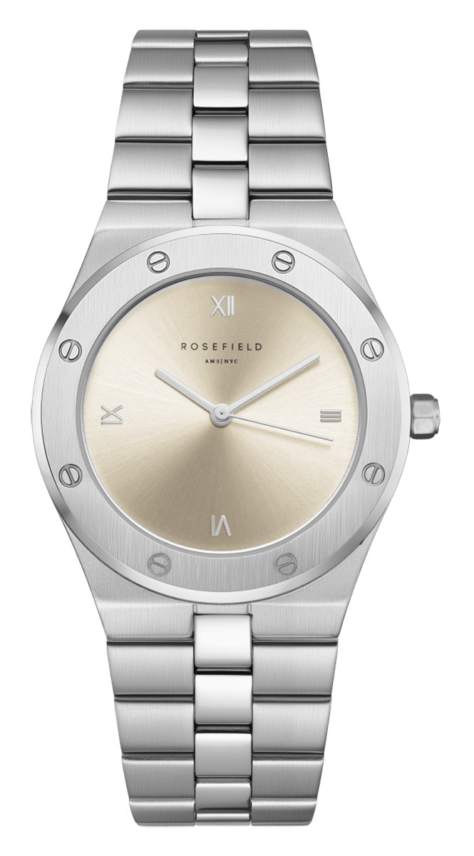 Rosefield Rose Ivory Sunray Silver SPCSSS-SP03 on täydellinen valinta naiselle, joka arvostaa kirkasta, hopeista eleganssia ja selkeää muotoilua. Tässä mallissa yhdistyvät teollinen, kulmikas muotokieli ja hienostunut naisellisuus. Kellon kruunaa upea Ivory Sunray -kellotaulu, jonka säteittäinen hionta leikkii valolla ja antaa pehmeän, norsunluunvalkoisen vastapainon kiiltävälle hopeiselle teräkselle.