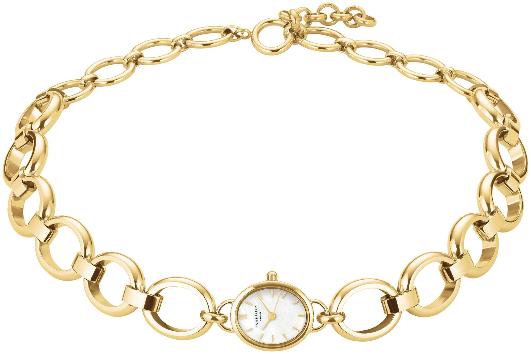 Rosefield Rosefield Studio Edition 05 Choker Gold STWGSG-ST02 on upea ja elegantti kello rannekorun muodossa. Tässä naisten kvartsikellossa on näyttävä ovaali ja kullanvärinen messinkirunko, jossa on helmiäiskellotaulu kullanvärisillä indekseillä ja viisareilla. Kellon runko on leveydeltään 15 mm ja paksuudeltaan vain 6,3 mm, tehden kellosta erittäin ohuen ja kevyen pidettävän. Mineraalilasi suojaa kellotaulua. Runkoon kiinnittyy 316L kirurginteräksestä valmistettu 14k keltakullattu ranneke, joka muodostuu pyöreistä lenkeistä. Ranneke on 42 cm pitkä, jonka voit kiertää useamman kerran ranteen ympäri. Kello on roiskevesitiivis.