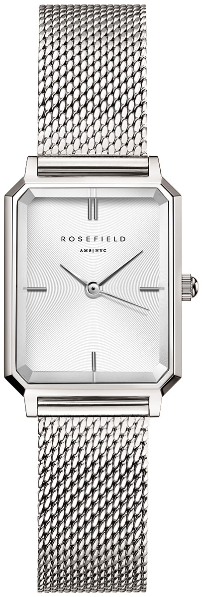 Rosefield The Octagon XS Mesh White Silver OWSMS-O74 naisten kahdeksankulmaisessa kvartsikellossa on klassinen, mutta moderni tunnelma, joka on varustettu upeilla yksityiskohdilla, kuten kiillotetulla 3D-lasilla ja rodinoidulla, ruostumattomasta teräksestä valmistetulla hopeanvärisellä mesh-rannekkeella. Rannekkeen leveys kiinnityskohdasta on 12 mm. Messinkirunko on leveydeltään 19,5 mm, pituudeltaan 24 mm ja paksuudeltaan vain 7 mm. Hopeanväristä ja minimalistista kellotaulua suojaa mineraalilasi. Kellotaulussa on hopeanväriset sekunti-, minuutti- ja tuntiviisarit.