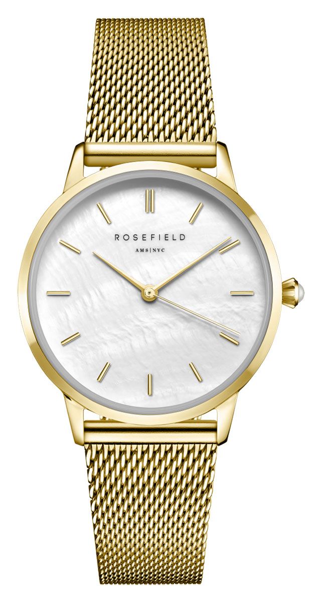 Rosefield The Pearl Edit Mesh White MOP Gold RMGMG-R06 on tyylikäs naisten rannekello. Kellon 36 mm leveä ja 7,5 mm paksu runko on valmistettu kullanvärisestä ruostumattomasta teräksestä. Runkoon kiinnittyy kullanvärinen teräsranneke, jonka leveys kiinnityskohdasta on 18 mm. Mineraalilasin alla suojassa on kaunis helmiäiskellotaulu. Kellon vesitiiviysluokitus on 30m / 3atm, eli se on roiskevesitiivis.