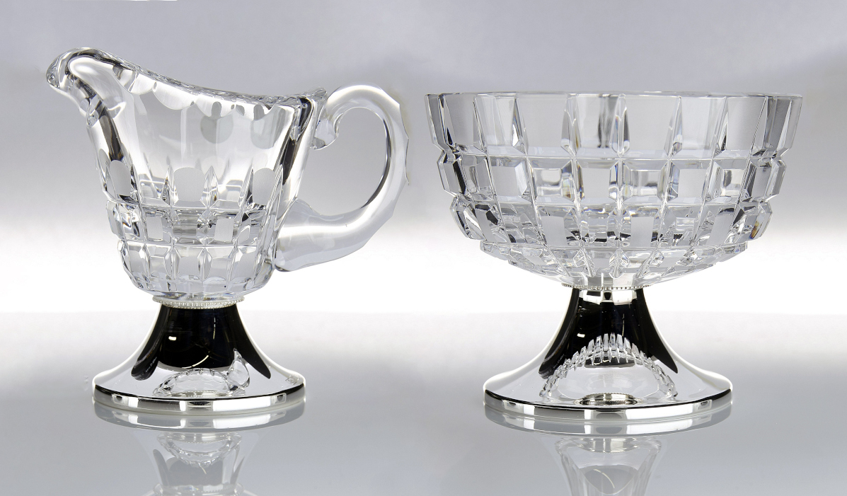 Riihimäen Lasille suunniteltu Ruutu-sarja on Aimo Okkolinin suunnittelema Suomalainen design-klassikko. Tämä Ruutu kalusto 781-167 on sisältää yhteensopivat sokerikon ja kermakon, jotka tuovat antisaikojen tyyliä kahvipöytään. Kermakon ja sokerikon kristallissa on Okkolinille tunnusomaiset syvät uurteet, ja astioita koristaa hopeajalat. Ruutu on ihana lahjaidea suomalaista muotoilua arvostavalle!