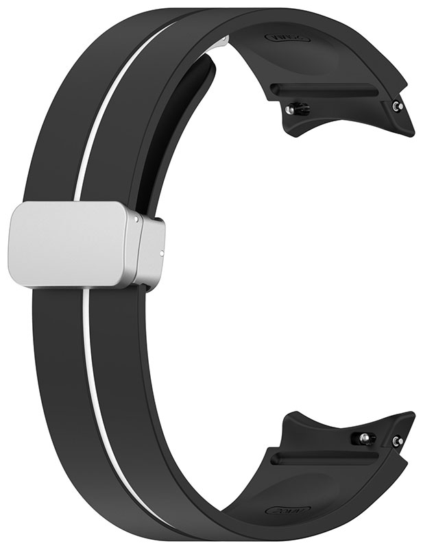 Samsung Galaxy Watch4 ja Watch5 silikoniranneke musta-valkoinena on laadukas ranneke Samsung Galaxy Watch4 ja Galaxy Watch5 kelloihin. Ranneke sopii kaikkiin Samsung Galaxy Watch4 ja Galaxy Watch5 malleihin. Rannekkeen kiinnitys kelloon tapahtuu pikajousinastoilla, joten rannekkeen kiinnittäminen ja irrottaminen käy helposti. Rannekkeessa on linkkulukko, joka kiinnittyy voimakkaalla magneetilla. Rannekkeessa on musta silikoniosa, jonka keskellä kulkee valkoinen raita. Linkkulukko on ruostumatonta terästä. Rannekkeen pituus on säädettävissä ja se sopii ranteisiin, joiden ympärysmitta on 130 - 200 mm. HUOM! Ranneke on tarvikeranneke ja se ei ole Samsungin valmistama!