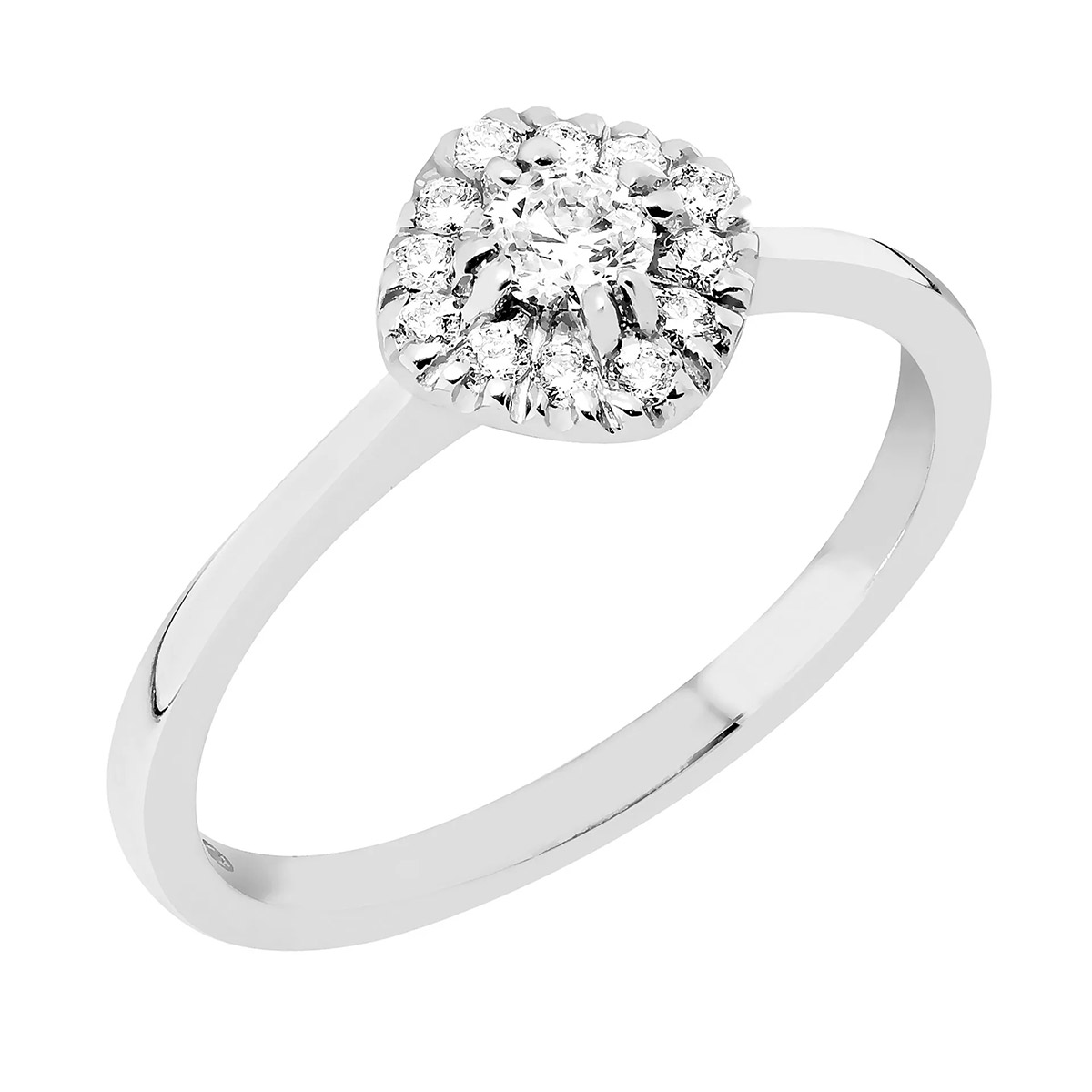 Sandberg Toivomuslähde V-707Bw timanttisormus vinolla halolla on moderni ja tyylikäs valinta. Hieman erilainen halokoriste antaa sormukselle omintakeisen ilmeen. Toivomuslähde halosormus istuu erilaisten syleilijöiden ja rivitimanttisormusten viereen korkean istutuksensa vuoksi. Keskitimanttina on 0,15 ct kokoinen briljanttihiottu timantti, jota reunustaa 12 pienempää timanttia. Timanttien laatuluokitus on Top Wesselton/VS ja niiden kokonaispaino on 0,25 ct. Sormuksen materiaali on 14 karaatin valkokultaa.