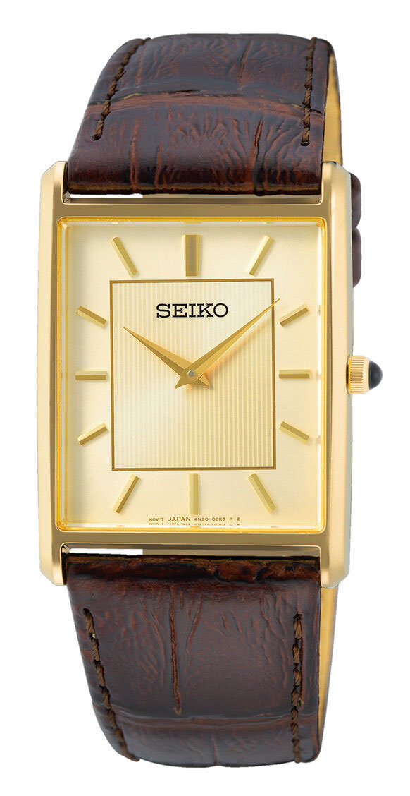 Seiko Classic SWR064P1 on suurempi versio Seikon SWR066P1 -rannekellosta, joka sopii mihin tahansa asusteeseen ja tilanteeseen. Tämä perinteinen suorakulmainen rannekello on varustettu 4N30 kaliiperin kvartsikoneistolla. Kultaista kellotaulua suojaa kestävä Hardlex-lasike ja kellon runko on valmistettu ruostumattomasta teräksestä. Runko on pituudeltaan 38 mm, leveydeltään 27,9 mm ja paksuudeltaan 6,1 mm. Ruskea ranneke on aitoa nahkaa, joka on leveydeltään 23 mm. Seiko Classic SWR064P1 kuuluu vesitiiviysluokkaan 30 m / 3 atm, eli se on roiskevesitiivis.