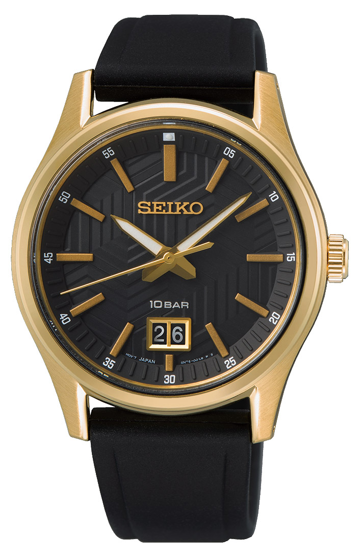 Seiko Essential Time SUR560P1 yhdistää näyttävän kullanvärisen viimeistelyn ja urheilullisen käytettävyyden. Kellon 39,5 mm runko on valmistettu kullanväriseksi pinnoitetusta ruostumattomasta teräksestä, ja se on profiililtaan miellyttävän ohut (9,8 mm). Lähes naarmuuntumaton safiirilasi suojaa tyylikästä, kuvioitua mustaa kellotaulua ja varmistaa erinomaisen kestävyyden päivittäisessä käytössä.