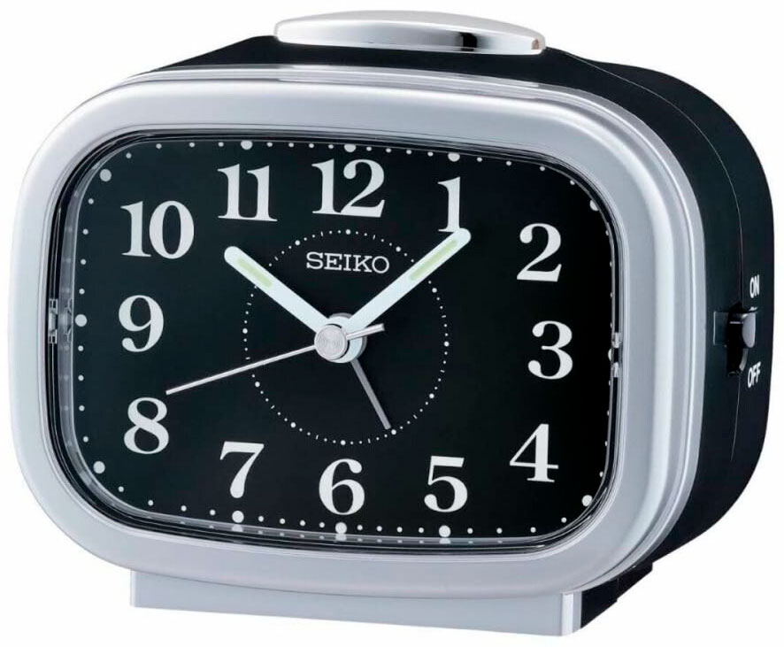 Seiko QHK060A on tyylikäs ja käytännöllinen herätyskello yöpöydällesi. Se on myös sopivan kokoinen matkalaukkuun, jolla se kantautuu helposti mukanasi matkustaessa. Hiljaisella liukusekuntiosoittimella varustetussa herätyskellossa on torkku-toiminto sekä selvät valkoiset numeroindeksit, jotka erottuvat hyvin mustaa kellotaulua vasten. Herätyskellon pituus on 9,9 cm, leveys 6,1 cm ja paksuus 8,4 cm. Seiko QHK060A toimii yhdellä C-alkaliparistolla.