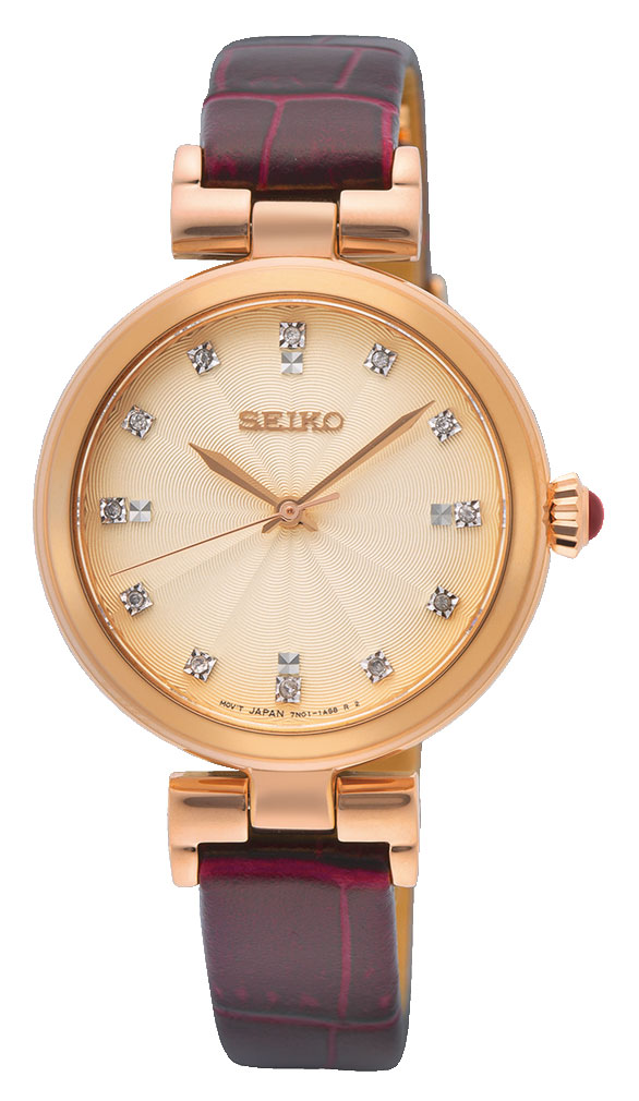 Seiko Ladies SRZ548P1 -kellossa on punakullan värinen kellotaulu, punertavan ruskea nahkaranneke ja punakullan värinen runko. Kellon rungon leveys on 30 mm ja paksuus 6,32 mm Kaikille Seiko-kelloille myönnetään 3 vuoden takuu ja ne toimitetaan valmistajan alkuperäisessä rasiassa.