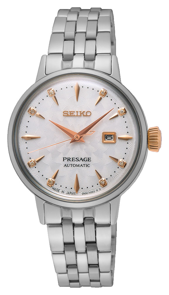 Seiko Presage Cocktail Time Clover Club Diamond Twist SRE009J1 on tyylikäs naisten kello, jonka ruostumattomasta teräksestä valmistettu 30,3 mm leveä ja 10,9 mm paksu runko on hopeanvärinen. Rannekkeena tässä mallissa on hopeanvärinen teräsranneke. Värimaailmaltaan Clover Club -cocktailia muistuttavan SRE009J1 -rannekellon ominaisuuksiin kuuluu päivyri. Seiko Presage Cocktail Time SRE009J1 -kellon valkoista emalista kellotaulua suojaa Seikon Hardlex-mineraalilasi. Kellotaulua koristaa 8 timanttia. Kellon tasaisesta käynnistä vastaa Seikon laadukas 2R05-automaattikoneisto 41 tunnin käyntivaralla ja manuaalisella viritysmahdollisuudella. Seiko Presage SRE009J1 kuuluu vesitiiviysluokkaan 50m / 5atm, joten se on rajoitetusti vesitiivis (uimista ei suositella). Kaikille Seiko-kelloille myönnetään 2 vuoden takuu ja ne toimitetaan valmistajan alkuperäisessä rasiassa.
