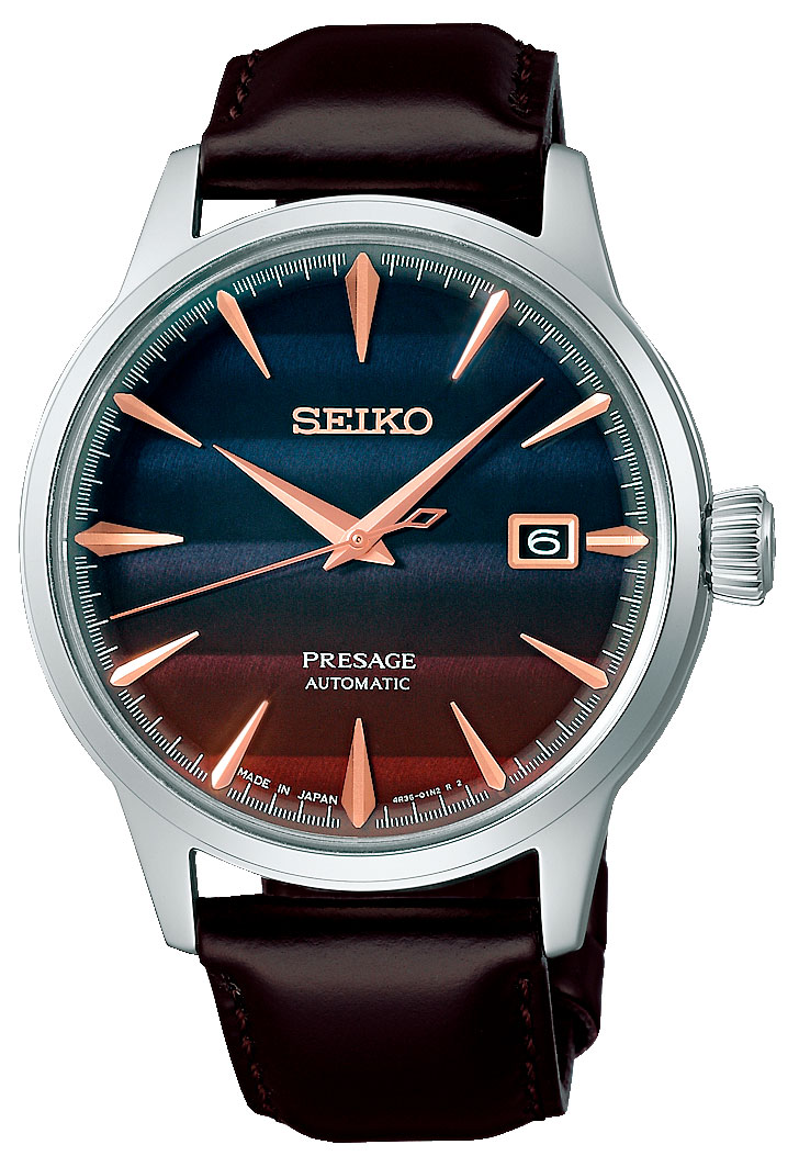 Seiko Presage Cocktail Time Star Bar Limited Edition Purple Sunset SRPK75J1 on tyylikäs 9000 kpl rajoitettuun erään kuuluva miesten rannekello japanilaisella estetiikalla, jonka läpinäkyvä takakansi paljastaa laadukkaan 4R35-kaliiperin automaattikoneiston koko komeudessaan. 23-kivisen koneiston käyntivara on noin 41 tuntia ja kellon virittäminen onnistuu myös käsin. Tämän rannekellon kellotaulu on saanut inspiraationsa Purple Sunset -cocktailista. Ruostumattomasta teräksestä valmistettu runko on 40,5 mm leveä ja 11,8 mm paksu. Kellotaulussa on päivyri klo 3 kohdassa ja todella näyttävän kellotaulun lisäksi siinä on ruskea nahkaranneke, joka on valmistettu vasikannahasta. Hardlex-mineraalilasi suojaa kelloa naarmuuntumiselta. Rungon takana on kaiverettuna kellon omakohtainen sarjanumero. Seiko Presage SRPK75J1 kuuluu vesitiiviysluokkaan 50m / 5atm, joten se on rajoitetusti vesitiivis (uimista ei suositella).