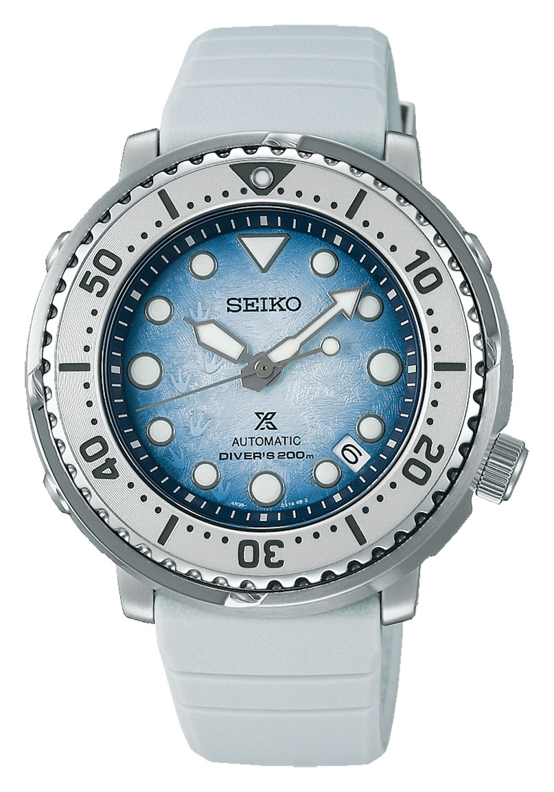 Seiko Prospex Save the Ocean Automatic Special Edition SRPG59K1 on toinen Seikon uunituoreista Antarktiksen inspiroimista kellomalleista. Tämä kello saa muotoilunsa Seikon tunnetusta Baby Tuna -kelloperheestä ja se voidaankin lukea siihen kuuluvaksi. Antarktis-Monsterinkin tavoin tämänkin kellon Antarktis-yksityiskohdat löytyvät sen taulusta: pingviinin räpylänjäljet jäisen pinnan päällä vievät ajatukset arktisiin maisemiin. Kesähelteillä tämän kellon katselu varmasti tuokin viilentävää helpotusta kuumuuteen. Näiden Antarktis-kellojen tarkoitus on muistuttaa meitä arktisten alueiden eläinten alati pahenevasta ahdingosta, ja osa Seikon Save the Ocean -malliston tuotoista meneekin merten tilan parantamisen eteen tehtävään työhön. Tässä ympäristötietoisesta kellomallista löytyy taulusta lisäksi päivyri kello neljän ja viiden väliltä.