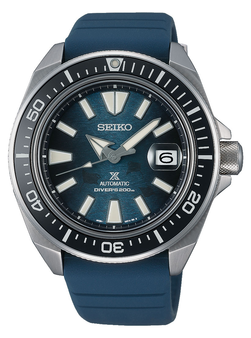Seiko Prospex Save the Ocean Special Edition Automatic SRPF79K1 on todella tyylikäs sukelluskello. Sen upeana yksityiskohtana erottuu sininen kellotaulu, joka on hillitysti kuvioitu. Seiko Prospex SRPF79K1 -kellossa on luminoinnit viisareissa, indekseissä ja pyöritettävässä bezelissä. Kellon 43,8 mm leveä ja 12,8 mm paksu runko on ruostumatonta terästä. Rannekkeena kellossa on sininen silikoniranneke. Kellossa on kestävä ja naarmuuntumaton safiirilasi, jossa on heijastamaton pinnoite sisäpuolella. Kello kolmessa on selkeälukuinen päivyri, jonka kohdalla on suurennuslasi. Tässä Seiko Prospex -kellossa on 23-kivinen 4R35-automaattikoneisto 41 tunnin käyntivaralla. Koneiston voi vetää myös käsin. Kellon vesitiiviysluokka on 200 m / 20 atm, joten se on erikoisvesitiivis ja soveltuu laitesukellukseen. Kaikille Seiko-kelloille myönnetään 3 vuoden takuu ja ne toimitetaan valmistajan alkuperäisessä rasiassa.