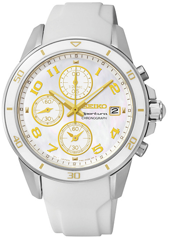 Naisten Seiko Sportura Chronograph SNDX53P1. Kellon rungon leveys on 38mm ja rannekkeen 16mm. Kellotaulu vaaleaa helmiäistä. kellosta löytyy ajanotto sekä päivyri. Kellolla on kahden vuoden takuu ja se toimitetaan valmistajan alkuperäisessä rasiassa.