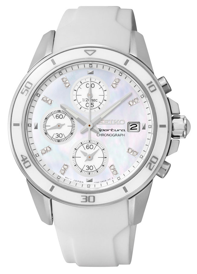 Naisten Seiko Sportura Chronograph SNDX57P1. Kellon rungon leveys on 38mm ja rannekkeen 16mm. Kellotauluun on upotettu 16 timanttia. Kellotaulu vaaleaa helmiäistä. kellosta löytyy ajanotto sekä päivyri. Kellolla on kahden vuoden takuu ja se toimitetaan valmistajan alkuperäisessä rasiassa.