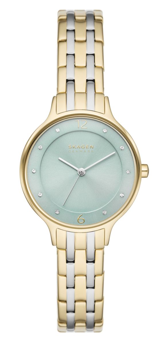Skagen Anita Lille 3-hands Two-tone Special Edition SKW3132 on tyylikäs naisten kello, jonka ruostumattomasta teräksestä valmistettu 30 mm leveä ja 5 mm paksu runko on kullanvärinen. Rannekkeena tässä mallissa on kaksivärinen teräsranneke, jonka leveys kiinnityskohdasta on 12 mm. Skagen Anita Lille 3-hands Two-tone Special Edition SKW3132 -kellon jäänsinistä kellotaulua suojaa mineraalilasi. Rannekellon indeksit on koristeltu korukivin. Kello kuuluu vesitiiviysluokkaan 50m / 5atm eli se on rajoitetusti vesitiivis (ei suositella uimista). Skagen-kellot toimitetaan valmistajan alkuperäisessä pakkauksessa ja niillä on kahden vuoden takuu.