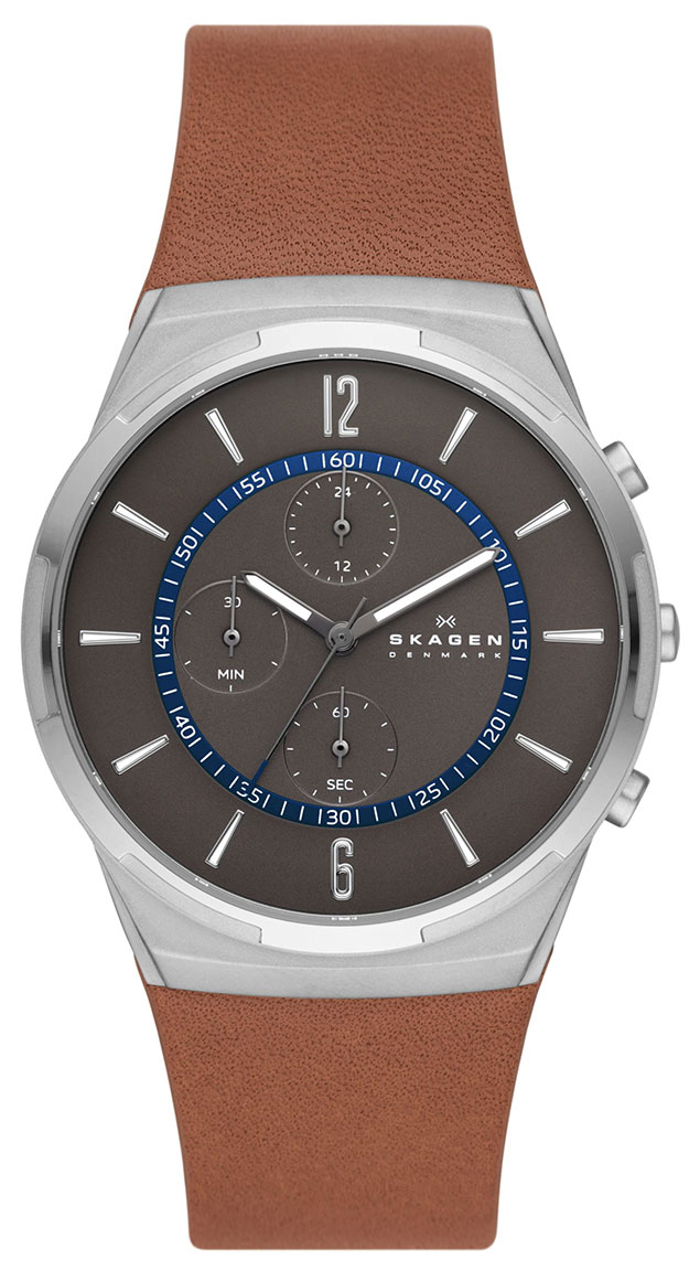 Skagen Melbye Chronograph SKW6805 on tyylikäs miesten kello, jonka kierrätetystä ruostumattomasta teräksestä valmistettu 42 mm leveä runko on hopeanvärinen. Rannekkeena tässä mallissa on ruskea nahkaranneke, jonka leveys kiinnityskohdasta on 25 mm. Kellon ominaisuuksiin kuuluu ajanotto ja 24 tunnin näyttö. Skagen SKW6805 -kellon sinistä kellotaulua suojaa mineraalilasi. Kello kuuluu vesitiiviysluokkaan 50m / 5atm eli se on rajoitetusti vesitiivis (uintia ei suositella). Skagen-kellot toimitetaan valmistajan alkuperäisessä pakkauksessa ja niillä on kahden vuoden takuu.