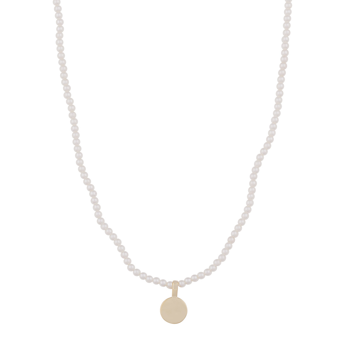 Modernin pelkistetty Snö of Sweden Essential -helminauha yhdistää harmonisesti klassisen valkoisen helmen ja kullansävyn. Kullatusta messingistä valmistettu kolikkoriipus asettuu kevyesti 2 mm:n lasihelmistä koostuvan kaulanauhan keskelle. Riipus 8 mm.