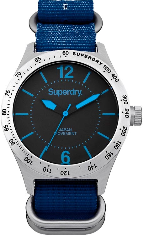 Superdry Field Professional SYG112U. Kellon rungon leveys 44mm ja rannekkeen leveys 22mm. Kellon mukana tulee lisäksi vastaava sini/harmaa/puna raitainen vaihtoranneke. Superdry kelloissa on japanilainen koneisto. Kelloille myönnetään 2 vuoden takuu ja ne toimitetaan valmistajan alkuperäisessä rasiassa.
