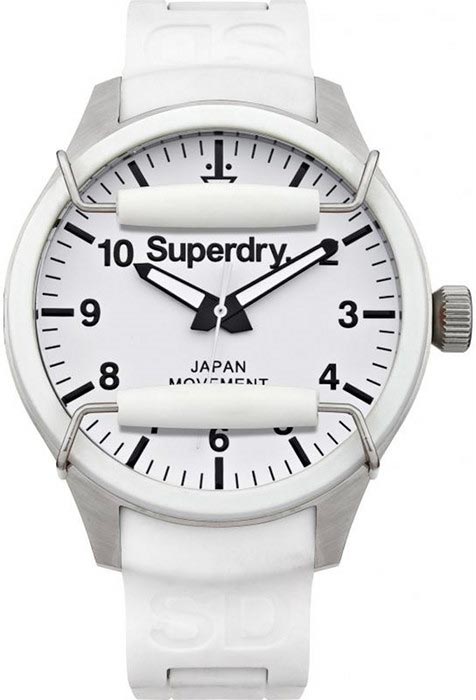 Superdry Scuba SYG109W. Kellon rungon leveys 44mm ja rannekkeen leveys 20mm. Kellotaulun ylä- ja alaosan päällä oleva "ristikko" on irrotettavissa. Superdry kelloissa on japanilainen koneisto. Kelloille myönnetään 2 vuoden takuu ja ne toimitetaan valmistajan alkuperäisessä rasiassa.