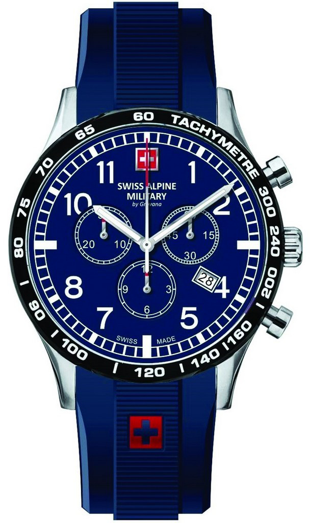 Swiss Alpine Military Aviator Chrono 1746.9835 ranteessasi olet aina ilmatilan herra! Tästä armeijahenkisestä mallista löytyy sekuntikello, takometri, päivyri, kirkkaat luminoinnit sekä ruostumaton 43 mm teräsrunko. 22 mm leveä ranneke on materiaaliltaan pehmeää silikonia. Kellossa on lisäksi kestävä safiirilasi. Aviator Chrono 1746.9837 -rannekellossa on sininen kellotaulu ja sininen silikoniranneke. Koneisto on Ronda RHQ 5030.D.