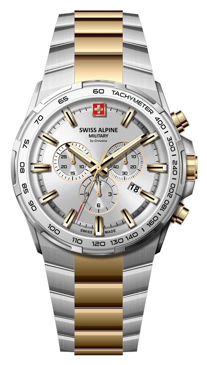 Swiss Alpine Military Eagle Rock 7071.9142 on kello sinulle, joka etsit näyttävää kronografia vaaleammalla ja hienostuneemmalla ilmeellä. Tämä Eagle Rock -sarjan bicolor-malli yhdistää saumattomasti hopeisen kellotaulun raikkauden ja kullanväristen yksityiskohtien tuoman luksuksen. Se on kello, joka huokuu itsevarmuutta ja sopii täydellisesti niin vaalean puvun kuin rennomman kesätyylin kumppaniksi.