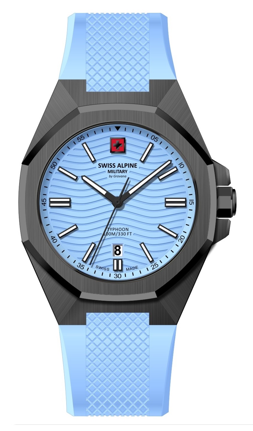 Swiss Alpine Military Typhoon 7006.1871 on näyttävä miesten rannekello, jonka musta 42 mm leveä runko on valmistettu ruostumattomasta teräksestä. Tyylikkään ulkonäön kruunaa 20 mm leveä vaaleansininen polyuretaaniranneke. Naarmuuntumattoman safiirilasin alla suojassa on vaaleansininen kellotaulu, jossa päivyri kello kuudessa. Koneisto RHQ 515/6. Swiss Alpine Military Typhoon kuuluu vesitiiviysluokkaan 100m / 10atm eli se soveltuu pintauintikäyttöön ja snorkkelisukellukseen, ei laitesukellukseen.