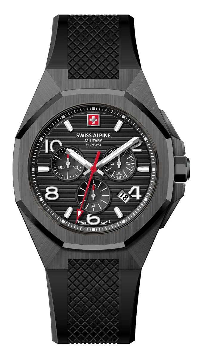 Swiss Alpine Military Typhoon Supersonic Chrono on kello sinulle, joka etsit näyttävää ja kestävää sveitsiläistä kronografia. Tässä Typhoon-sarjan mallissa yhdistyvät sotilaallinen jämäkkyys ja moderni, kulmikas muotoilu, joka huokuu nopeutta ja teknistä tarkkuutta. Kokomusta olemus ja punaiset yksityiskohdat tekevät tästä kellosta todellisen katseenvangitsijan ranteessa.