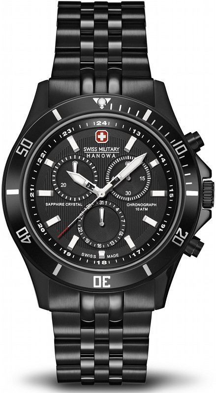 Swiss Military Flagship Chrono 6-5183.13.007 rannekello. Kellossa teräsrunko, jonka leveys 42mm ja teräsranneke, jonka leveys 20mm. Kellossa safiirilasi, ajanotto sekä päivyri. Swiss Military Hanowa kelloille myönnetään 2 vuoden takuu. Kello toimitetaan valmistajan alkuperäisessä rasiassa postikuluitta!