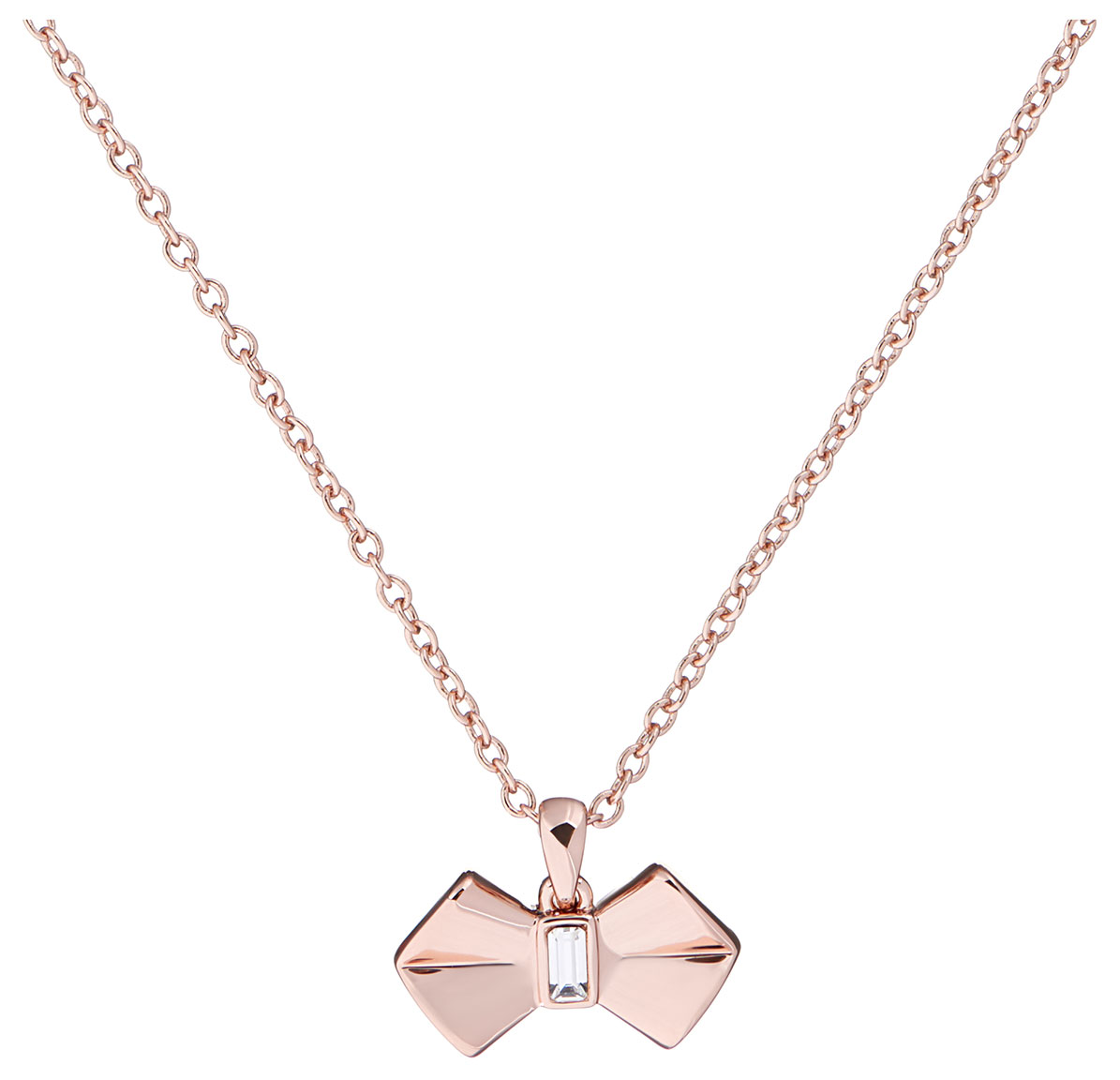 Ted Baker Sarahli Solitaire Bow TBJ2164-24-02 on tyylikäs kaulakoru, joka sopii niin arkeen kuin juhliinkin. Kaulakoru on valmistettu ruusukullanvärisestä messingistä. Kaulaketjun pituus on 42-47 cm ja siinä riippuu 10 x 18 x 3 mm kokoinen rusetinmuotoinen riipus, jossa aito Swarovskin kristalli. Ted Baker -korut toimitetaan valmistajan alkuperäisessä rasiassa ja niillä on yhden vuoden takuu.