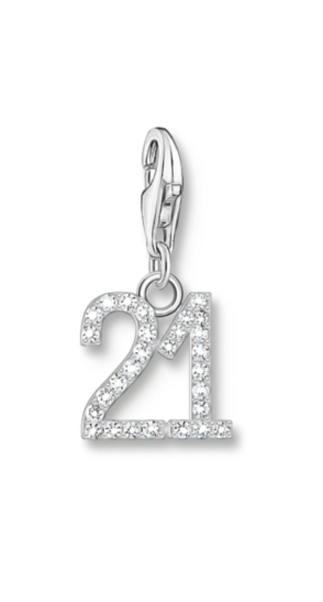 Kanna lempinumeroitasi korujen muodossa. Thomas Sabo Charm Club Charmista 21 Hela 2135-051-21 on koristeltu luvulla 21. Numerokoru on valmistettu sterling-hopeasta. Korun koko on 22 mm.