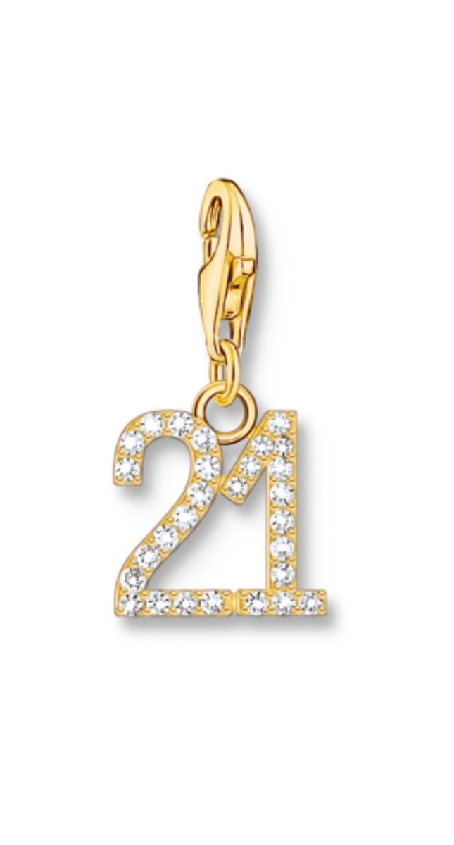 Kanna lempinumeroitasi korujen muodossa. Thomas Sabo Charm Club Charmista 21 Hela 2140-414-39 on koristeltu luvulla 21. Numerokoru on valmistettu 18-karaatin kullatusta sterling-hopeasta. Korun koko on 22 mm.