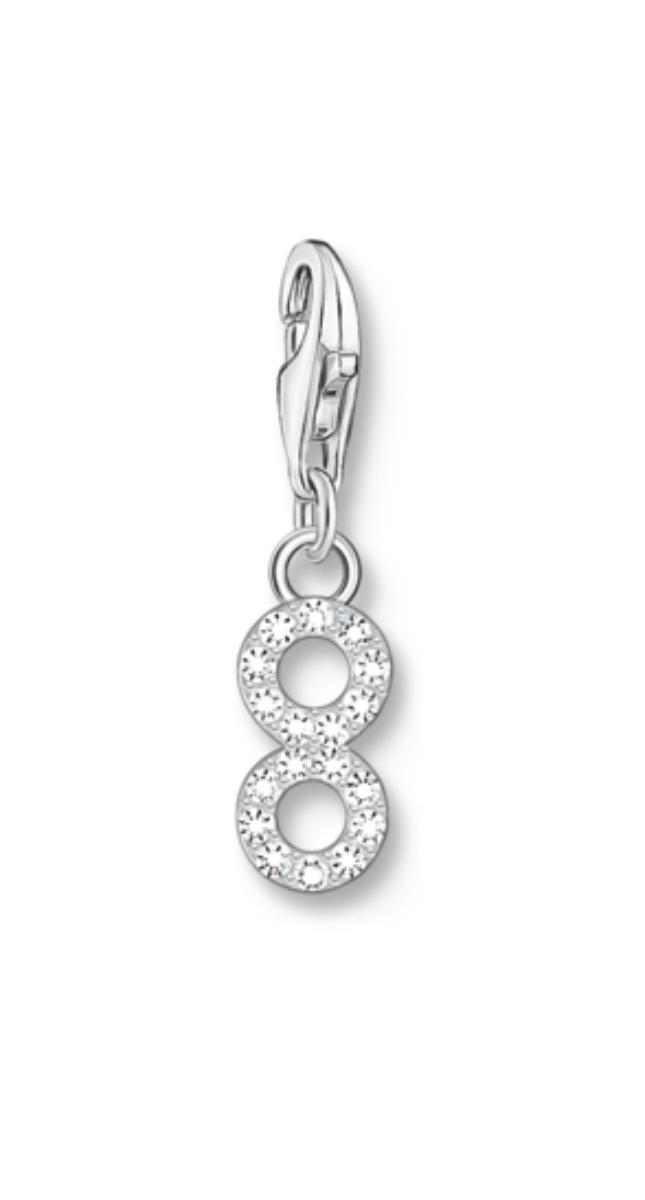 Kanna lempinumeroitasi korujen muodossa. Thomas Sabo Charm Club Charmista 8 Hela 2132-051-21 on koristeltu luvulla 8. Numerokoru on valmistettu sterling-hopeasta. Korun koko on 23 mm.