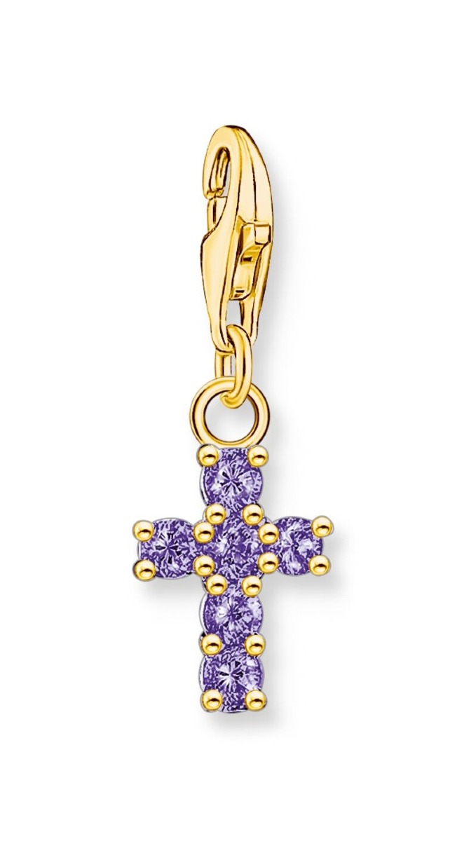 Thomas Sabo Charm Club Charmista cross purple stones yellow-gold plated hela 2036-414-13 on valmistettu 18-karaatin kullatusta sterling-hopeasta. Ristiriipusta koristaa useat briljanttihiotut, kruunuistutetut kivet. Riipuksen koko on 25 x 9 mm.