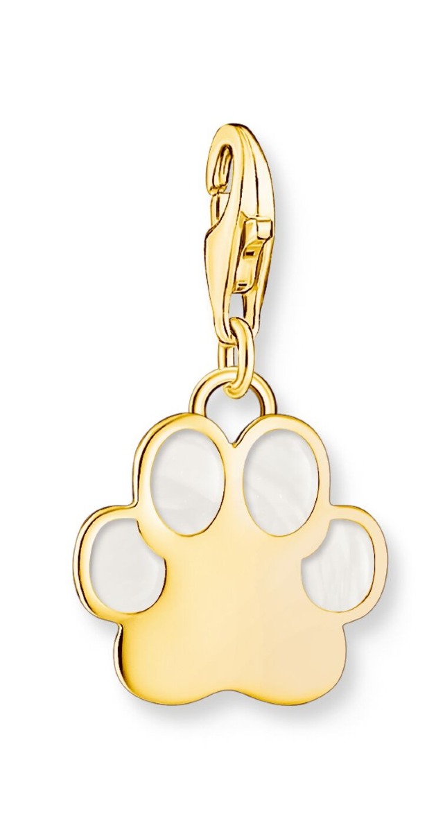 Thomas Sabo Charm Club Charmista dog paw enamel yellow-gold plated hela 2014-427-39 on valmistettu 18-karaatin kullatusta sterling-hopeasta, ja tassukorua koristaa valkoinen emalointi. Tassuriipuksen koko on 24 x 14 mm.