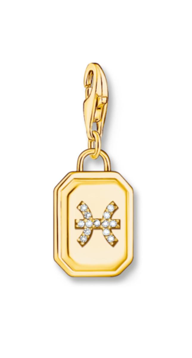 Thomas Sabo Charm Club Charmista kalat hela 2154-414-39 koristaa kalojen tähtimerkki. Horoskooppikoru on kooltaan 26 mm, ja se on valmistettu 18-karaatin kullatusta sterling-hopeasta.