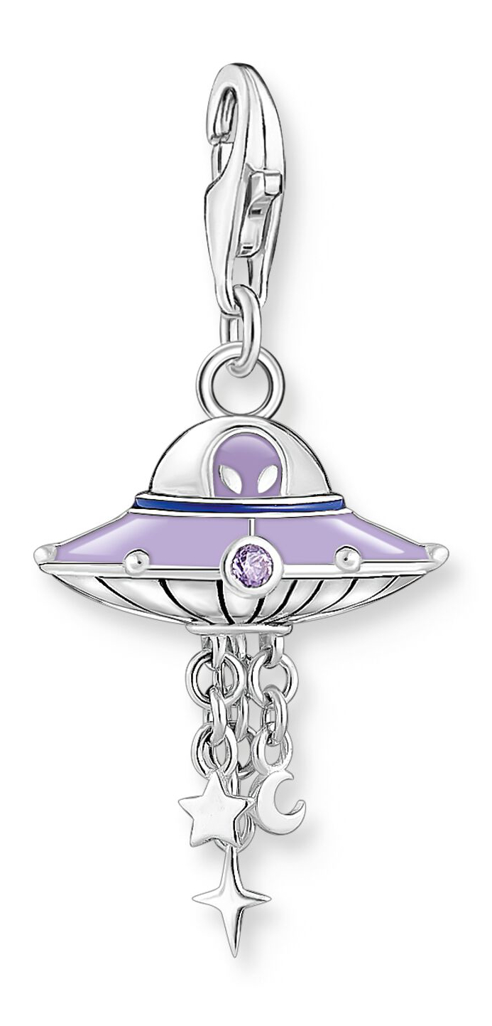 Siirrä katseet taivaalle tämän Thomas Sabo Charm Club Charmista UFO violet enamel stones silver blackened 2045-691-7 -UFO-korun avulla. Koru esittää lentävää vierasta esinettä, ja sitä koristaa violetti emalointi, sekä synteettiset zirkoniat ja lasikivet. UFO-korun koko on 31 x 15 mm.